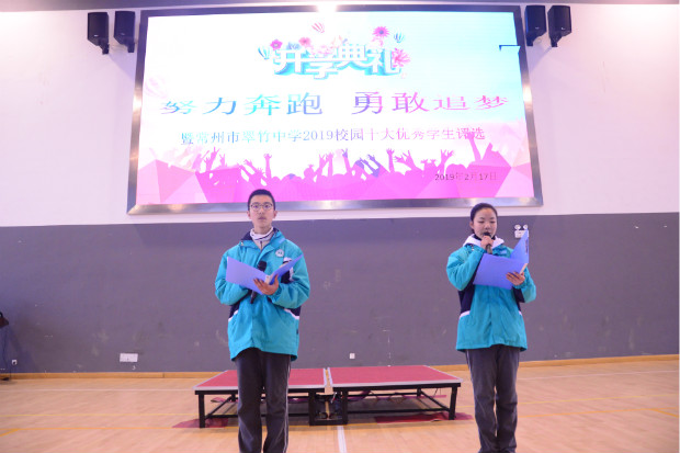 2月17日报到日,常州市翠竹中学全体师生齐聚体育馆,参加“努力奔跑,勇敢追梦”新学期开学典礼。 开学典礼以校园十大优秀学生的选拔为主要内容,七八九三个年级的优秀学生候选人分别从三个流程展示:用小视频展示个人形象,亲切具体;用主题演讲凸显个人才能,优势突出;用现场问答考验个人反应,灵敏直观。三个流程全方位多角度地展现了学生的形象,帮助老师同学更好的了解他们,促进竞争的公平公正,使得优秀学生的形象更加深入人心。 少年强则中国强,少年,是国家的希望,是未来的栋梁。翠竹中学致力于课改,大力发展素质教育,致力于培养更多的有责任感有担当的优秀的社会主义接班人。 这次选拔除了突出候选人的能力,鼓励他们按照要求自主独立的准备展示,更难能可贵的是引导优秀学生关注社会关注学校,引导他们发现身边的问题,并积极思考相应对策。比如:在现场问答环节中,问题的选择来自身边,像家长接送孩子时乱停车现象的解决方法,对校园不文明现象的看法,对所谓校服“潮流”穿法的建议等等。学校希望通过活动,引导优秀学生自觉承担起更多的责任,激发他们的使命感责任感,传播正能量,同时,全方位多角度向老师同学展现优秀学生的形象,有利于增强优秀学生的知名度,树立榜样,增强榜样的辐射强度。 最后,15位优秀学生候选人向在座的师生献上新学期祝福,翠竹中学2019年春学期开学典礼在浓浓的祝福暖暖的春意中拉下了帷幕。(毛乐乐)