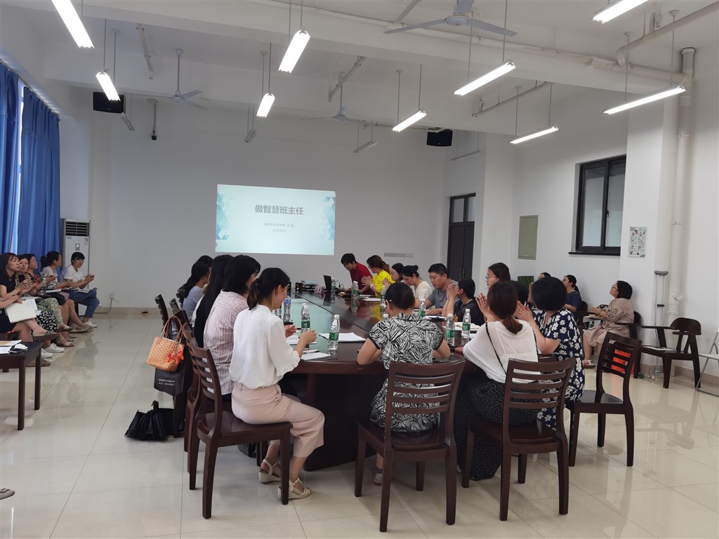 秋雨霏霏飘飘洒洒,暑假也就接近尾声为了帮助31位班主任更好地开展开学工作,智仁工作室邀请了常州市首批特级班主任、常州北环中学吕丽老师给大家分享做智慧班主任的经验本次会议由德育主任单斐老师主持,德育校长丁文黎副校长、教导处卫萍主任、三位年级组长和全体班主任出席。