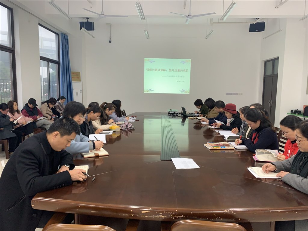 寒意骤降,阴雨连绵,秋去冬来,阵阵凉风吹来,吹不散初三毕业班教师的拼搏之心,在季节交替间,所有教师也在总结得失,调整新的策略,迎接更大的挑战。全体初三科任老师聚集在一起,开展九年级期中质量分析会。