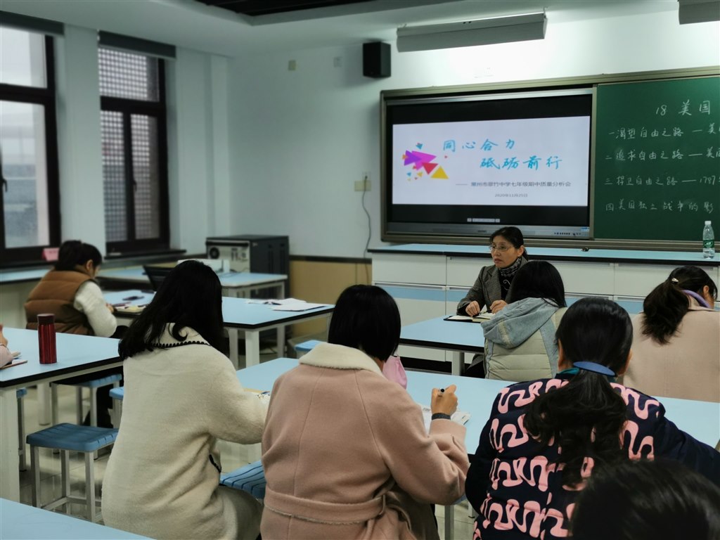 七年级研讨会由年级组长屠琍老师主持,丁文黎副校长与会指导。首先,屠老师回顾了七年级半学期以来的教育教学工作。她对七年级组老师的团结、勤恳、敬业,负责与奉献精神给予了高度的点赞与感谢。接着她对本次期中调研情况进行了数据展示与分析。她谈到,在此次7校联考中学校成绩喜人,各门学科位居前列,并且各班间的差距也很小,这是七年级全体老师共同奋斗的成果。接下来,屠老师结合学生问卷调查反馈提出了下阶段教育教学工作中需加强的几个建议:1、常规为首,坚持不懈;2、班干部培养,助力班级管理;3、精心备课,精讲精练;4、胜在合力,各科之间通力配合。
