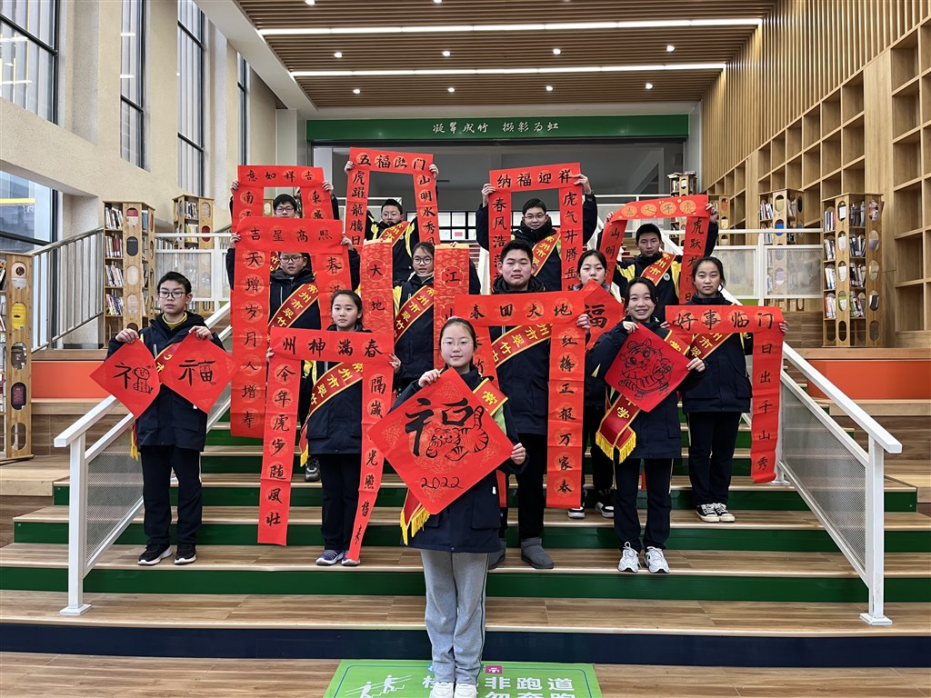 满怀爱心的少年们早早带齐书法工具到校准备,同学们铺开毛毡,蘸上墨水,提笔写下一句句暖心的新年祝福,会议室内顿时墨香四溢,暖流涌动。每位同学写的“福”和春联各有千秋,有同学在一张红纸写五个不一样的福字,寓意五福临门、新意十足;有的福字里藏着一只小老虎,寓意虎虎生威、新年大吉;“纳福迎祥”、“吉星高照”、“春满神州”等吉祥贺词分别成为了春联中的C位。