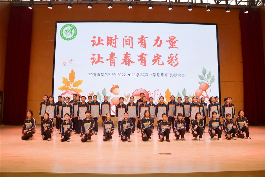 夏隐秋临,寒来暑往,时光斑驳,青春璀璨,翠中人蕴蓄力量,不断拔节。11月24日下午,常州市翠竹中学举行了2022-2023学年七八九年级第一学期期中表彰大会,见证优秀学子的一路成长,鼓舞更多翠中少年锐意进取,共同前行。 【第一篇章】:笃行,让时间有力量 伴着温馨而悠扬的校歌,竹音合唱团一展风采,拉开大会的序幕。十位来自各班的时光少年,分享过去的记忆之最。青春斑驳,烙印在成长的脚步里,步履昂扬,或是运动会的拼搏激情,或是国旗班训练的积极蜕变……每一点喜怒哀乐,是成长,也是蜕变。每一个日月星辰,是回忆,也是力量。 最激动人心的时刻到了!课程处卫主任宣读期中之星表彰名单,在本学期的各项评比中,又一批优秀的集体和同学脱颖而出,获得了属于他们的成长勋章。青青翠竹,群星闪耀,笃行,让时间有力量;奋斗,让青春更光彩!期待更多的翠中人能在后半程持续发力,获得更优异的成绩,摘得更多的硕果! 【第二篇章】:感恩,让岁月有温度 蓬升麻中,不扶自直;白沙在涅,与之俱黑。优秀的个体成长,离不开优秀的集体;优秀的个体发展,也会造就更具战斗力的团队!学发处王主任宣读九月暨开学工作好、十月份流动红旗的优胜班集体,信息发展处王强主任为科技节颁奖。温暖的集体,给予我们成长的沃土,带给我们力量,引领我们方向! 青春是迷茫的,学习的压力,成长的选择,身边的诱惑,家庭的无力……往往会让困境的我们如临深渊,如履薄冰。错误的方式有时是孩子们求救的信号,无知的行为有时是孩子们无助的选择。成长路上,离不开集体的温暖,伙伴的互助,更离不开师长的帮扶与陪伴!七8班作为导师制的试点班级,一个月以来进步显著,班主任鲁老师作为导师代表发言,分享导师与孩子们的温馨相处。 为进一步推广导师制,帮扶更多有需要的孩子,校党总发动更多党员先锋教师加入这一队伍,党支宋主任宣读受聘导师名单,党员委员代表上台接受聘书,不放过任何一个希望,不放弃任何一个孩子,不放松任何一个问题,以心换心,用爱陪伴!立志与孩子们共成长! 【第三篇章】:梦想,让青春有方向 会议最后,章艳校长慷慨激昂,为学生们送上成长寄语。章校结合热点,抓住当下,引用卡塔尔世界杯的宣传语now is all,鼓励每一位翠中少年青春可期,未来可追,心中有火,眼里有光!风趣幽默,掀起会场阵阵热烈的掌声! 让时间有力量,让青春有光彩。此次表彰大会,不仅是对前一阶段学习的表彰,也是开启今后学习的动员大会。相信翠中全体师生必能以更高的热情,百倍的信心,携手共进,再创辉煌!