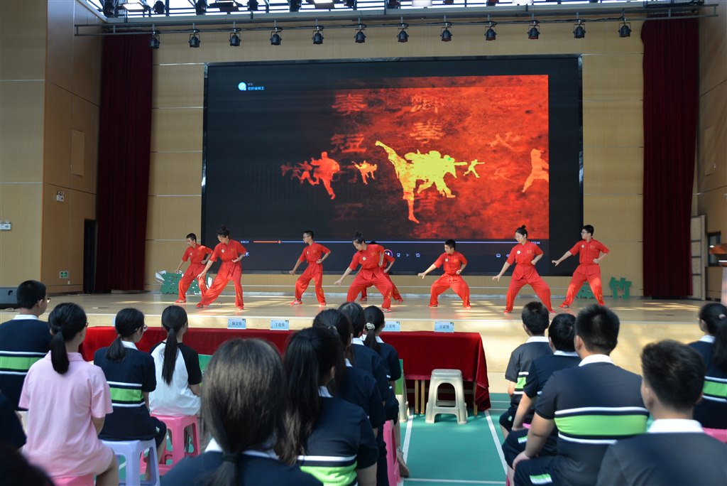 在憧憬的眼神、热切地期待中,一场武术表演成为了夏令营开营的亮点。舞台上,学校武术社团的同学们身着红色、黄色道袍,舞动着行云流水般的招式将古代壮丽和现代活力完美结合,展现了翠中学子的勃然生机