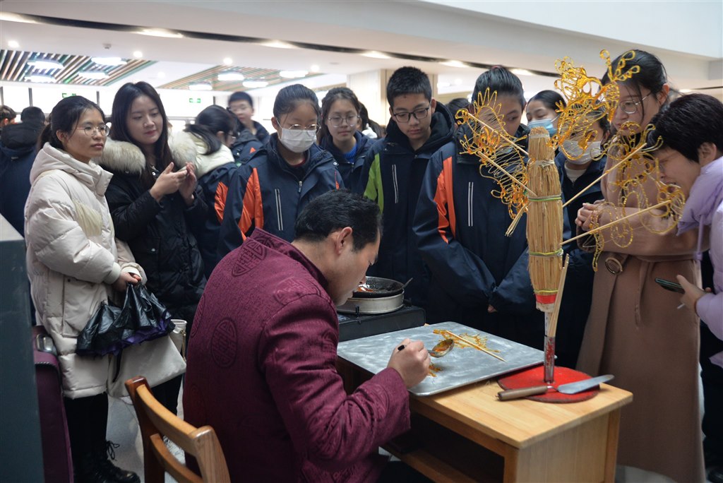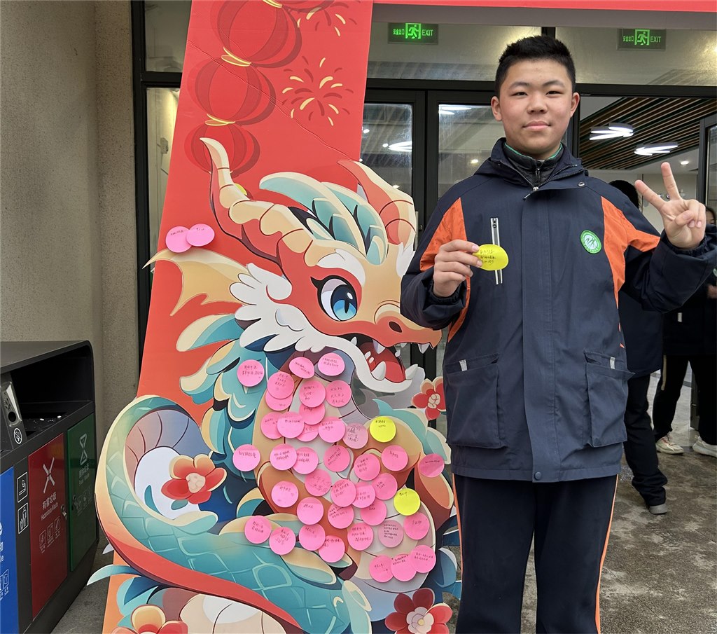 逾跃门,新年梦想站:一座醒目的飞龙立牌,宛如引领者,引领孩子们跃过门,许下龙鳞心愿一楼活动中心,学校精心设计了个互动环节:猜灯谜糖画制作。在非遗传承人——糖画吕师傅“龙飞凤舞”地勾勒下,“蝴蝶”“恐龙”“玉兔”“飞龙”“骏马”……一个个好看又好吃的糖画让这个开学多了一丝惊喜,一丝甜蜜。孩子们在观看、体验、互动的过程中感受传统文化的独特魅力,唤醒青春纯粹快乐