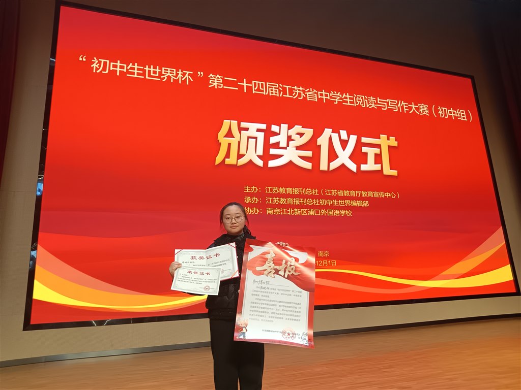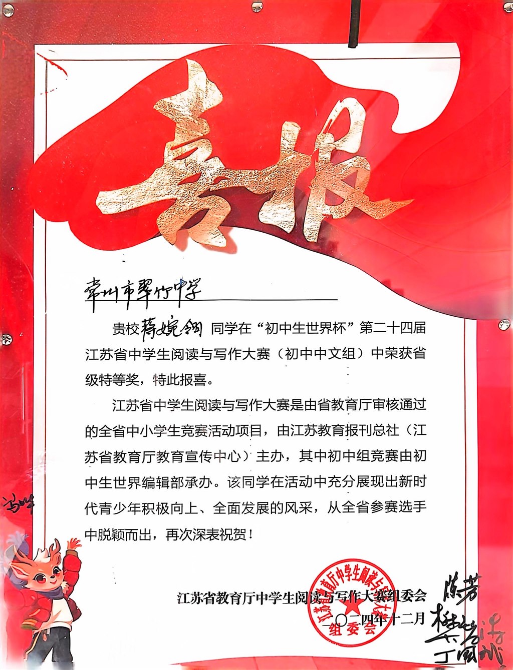 青筠直上,翠竹拔节。在“初中生世界杯”第二十四届江苏省中学生阅读与写作大赛(初中组)中,常州市翠竹中学九(1)班蒋婉翎同学荣获省级特等奖。