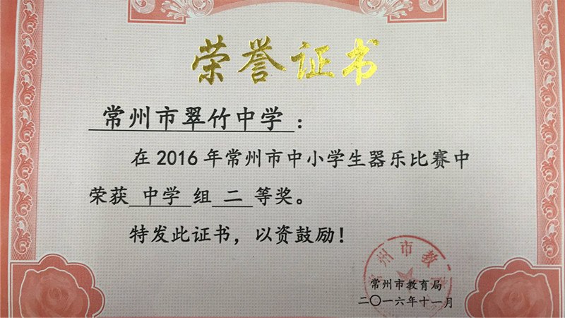 2016年常州市中小学生器乐比赛落下帷幕,翠竹中学李佳怡、陶昱如、薛柠、芦昳四位同学表演的弦乐四重奏《瑶族舞曲》荣获中学组二等奖。
