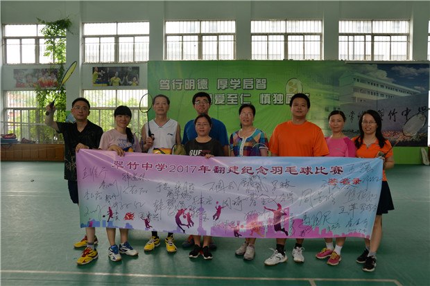 2017年7月4日下午一点半翠竹中学教职工在翠竹中学体育馆举办“翠羽杯”羽毛球纪念赛。本次活动恰逢翠竹中学建校二十周年,在学校即将原址翻建,体育馆即将拆除之际,为了传承学校羽毛球文化,丰富教职工业余生活,特此举办本次纪念赛。   下午一点开始,教职工们陆陆续续的来到体育馆,掩饰不住的是对于羽毛球运动的热爱。本次活动分为三个环节:签名留影、比赛和颁奖。来到场地的所有参赛选手们首先在签名录上留下自己的名字,而后来到场地中间进行大合影。本次比赛分为四组,分别为:吴栋校长带领的明德队,潘亮生校长带领的启智队,路云书记带领的博爱队和周贵兴书记带领的励志队。在本次主裁判余忠教练宣读完对战顺序和比赛规则后,吴栋校长宣布比赛正式开始。 四个组别的队长根据本队以及对方的实际情况进行排兵布阵,比赛开始,四个场地的较量就此拉开序幕。过程中有欢笑有认真有坚韧有顽强,直到下午四点半,比赛正式结束。吴栋校长为每一位参赛选手颁发奖品。比赛或许必有输赢,但是翠中羽毛球爱好者打出一场没有输赢的羽毛球比赛。    七月是翠中中学翻建的开始,球馆也将拆除,但翠中的羽毛球爱好者们一直在这里,为着心中的热爱,为着心中的情怀!七月我们不说再见,这就是羽毛球运动的魅力。