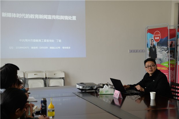 323日,常州市翠竹中学邀请市教育局宣传处丁皓处长来校为学校中层及党员项目组成员开设新闻宣传培训讲座。讲座在一楼会议室举行,由路云副书记主持。