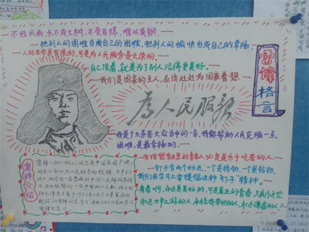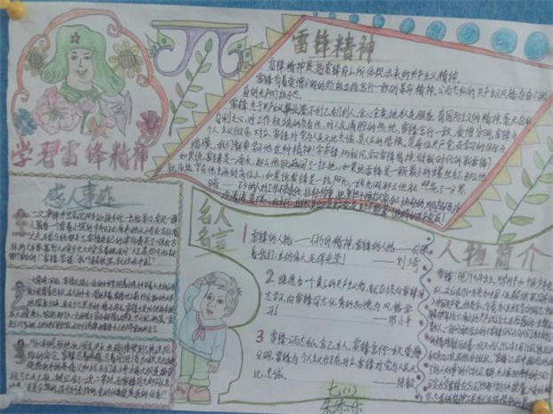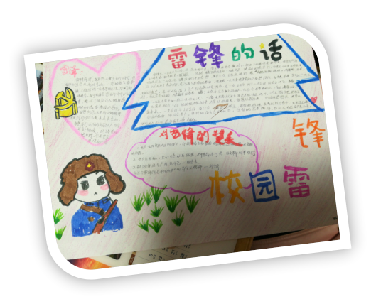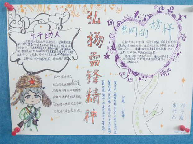 同学们按照小组分工,有的小组通过设计制作雷锋小报,学习雷锋精神;有的准备雷锋演讲,新时代重读雷锋故事,交流雷锋带给我们的触动与思考;有的化作行动,学习雷锋做实事的服务精神,和父母、同学利用节假日前往社区、敬老院打扫卫生,慰问老人,奉献爱心。