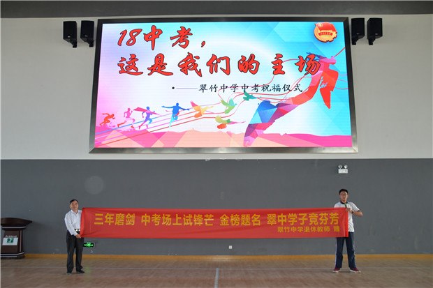时光匆匆,三年来你们点点滴滴成长的画面仿佛就在我的眼前, 岁月如梭,三年来你们日夜奋斗的歌声仿佛就在我的耳边, 三年的携手前进,三年的美好相伴,都是心头无数温暖的记忆…… 记不清多少次跌倒又爬起,数不清多少次迷茫后坚定,一次次的拼搏与努力,都化作你们前行的动力。一天天,望着你们长大,一天天,陪着你们成熟,爱在心头,口却难开。 三年磨一剑,出鞘试锋芒。如今,还有5天,你们就要踏上2018中考的战场。 或许,你很紧张,或许,你依旧迷茫,或许,你很懊悔,或许,你斗志昂扬, 但请你们记住:中考不是决定命运的惟一因素,稳定心态,相信自己! 也请你们记住:胜利一定在不远的未来,等待着你们! 我们永远是你们最坚强的后盾!我们,将永远祝福你们!” 伴着动人的旋律,看着大屏幕上三年成长的点滴,10位初三班主任暖暖的话语,温暖与感动涌上心头。看着学弟学妹们绽放的笑脸,热情洋溢的加油,激动与幸福荡在心间。 情谊真真,祝福深深,除此以外,学校还为每一位初三学子送上了一份精心准备的特殊礼物—— 一群来自不同高中、高职校的,已毕业的翠中学子们,都纷纷向母校的学弟学妹们送上真诚的祝福,发出热情的呼唤!或是感慨对中考的回忆,或是真挚地为母校祝福,或是俏皮地鼓气加油。“我们与你们同在!我们在这里等你!”每一位翠中人无不为之振奋!为之感动! 三年磨剑,中考场上试锋芒;金榜题名,翠中学子竞芬芳。最后,退休的老教师蒋贵琦书记作为特殊的嘉宾,亲手送来了横幅,期待我们九年级学子再创佳绩!